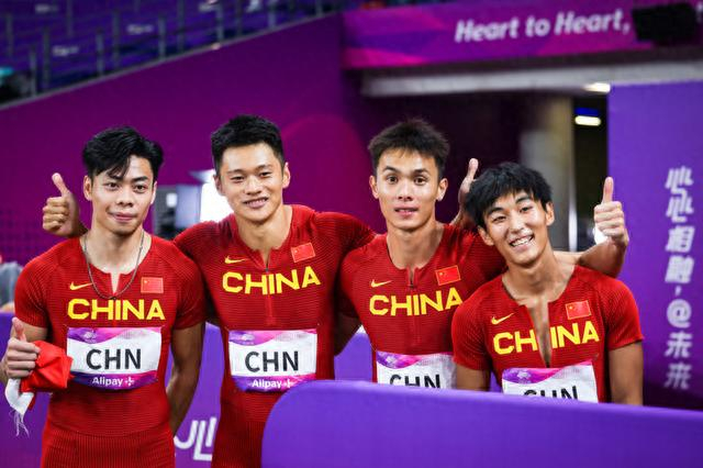 2023年10月3日,杭州亚运会男子4x100米接力决赛,由陈冠锋、谢震业、严海滨、陈佳鹏组成的中国队以38秒29夺冠。 中国队选手陈冠锋、谢震业、严海滨、陈佳鹏(从左至右)在比赛后。