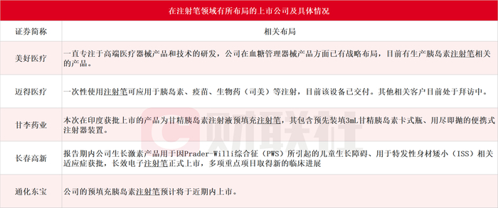 据财联社不完全统计,在注射笔领域有所布局的A股上市公司包括美好医疗、迈得医疗、甘李药业、长春高新和通化东宝等,具体如下: