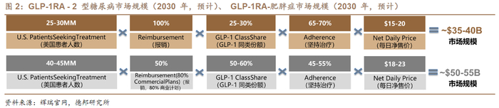 根据辉瑞公司报告,预计2030年GLP-1在2型糖尿病和肥胖领域的全球市场规模可达900亿美元;其中2型糖尿病药物市场约占350-400亿美元,减肥药物市场约占500-550亿美元。