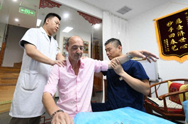 杨臣大夫(右)和助手一起对马可进行罗氏正骨法治疗。