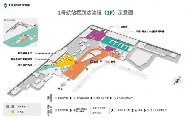 虹桥国际机场2号航站楼到达层共有2个出口,分别是:1F到达层、2F彩虹桥(无托运行李通道),如图所示。
