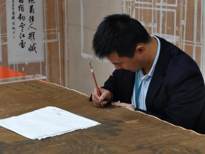 “我们希望修复主题类的展览可以在一定程度上向广大观众揭开文物修复的神秘面纱,普及文物收藏养护知识;也希望可以通过艺术史学研究,特别是艺术科技史的研究理论和方法,展示不同时期艺术品的创作风格及特色。”张雪松说。看不见的文物修复师的身影,其实出现在奉博的每一个大展中。例如,确定承办“丹甲青文——中国汉字文物精华展”后,奉博文保中心的首要任务就是修复《升仙太子碑碑拓》,升仙太子碑原碑高6.70米,宽1.55米,巨大的尺幅带来繁琐的修复过程,从修补、小拖、全色、托绫、打料、镶嵌、覆背、砑画……团队耗时近四十多天才完成任务。