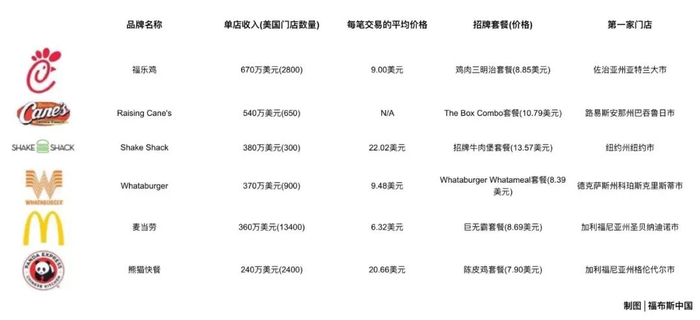 数据来源:QSR杂志2022年QSR 50排行榜,Euromonitor International价格以德克萨斯州休斯顿为基准