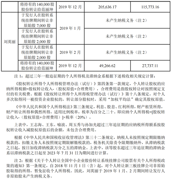 前述 6 名非发行人员工股东未缴纳个税及滞纳金,公司已发出沟通函,通知股东依法申报并缴纳税款。此外,因发行人不掌握在股转系统挂牌期间的股份交易情况,无法以加权平均法计算转让股权的原值及相关合理成本,该等股东应纳个人所得税额及滞纳金应以税务机关核定金额为准,该等股东在摘牌后的股权交易情况如下: