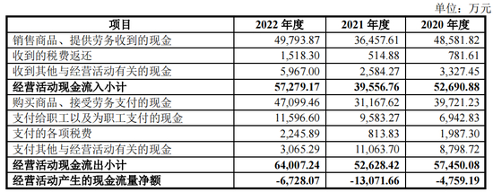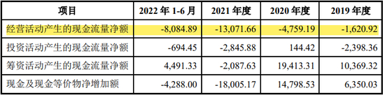 2019年-2022年1-6月,明朝万达营业收入分别为3.183亿元、3.999亿元、4.7亿元和1.246亿元,净利润分别为2,275.31万元、5,530.39万元、4,744.41万元和-1,803.73万元。报告期内,公司经营活动产生的现金流量净额分别为-1,620.92万元、-4,759.19万元、-1.307亿元和-8,084.89万元。报告期内,公司经营活动产生的现金流量净额持续为负,低于当期净利润水平。