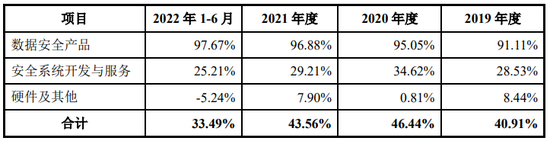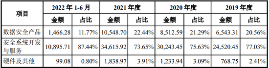 2019-2022年1-6月,明朝万达安全系统开发与服务业务收入分别为2.452亿元、3.024亿元、3.462亿元和1.09亿元,占主营业务收入的比例分别为77.03%、75.63%、73.65%和87.44%,为公司的核心业务板块;数据安全产品是以公司自主研发的核心技术为基础开发的软件或软硬一体的标准化产品,通用性较强,可以被用户直接使用,一般不需要二次开发。报告期各期,公司数据安全产品销售收入分别为6,543.31万元、8,512.59万元、1.055亿元和1,466.28万元,占营业收入的比重分别为20.56%、21.29%、22.44%和11.77%。