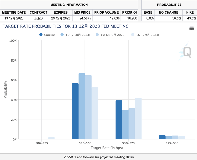 上述数据发布后,市场加大了对美联储年内加息的押注。CME美联储观察工具显示,认为美联储12月维持利率不变的可能性为56.5%,加息25个基点的可能性为39.5%,此前一天的数据分别为66.98%和29.8%。