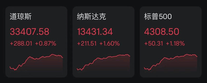 但随后,市场上演了戏剧性反转。美债收益率逐步回吐半数以上的升幅,美股三大指数盘中转涨,最终,三大指数集体收涨。纳指收涨211.51点,涨幅1.6%,报13431.34点;标普收涨50.31点,涨幅1.18%,报4308.5点;道指收涨288.01点,涨幅0.87%,报33407.58点。本周,道指跌0.3%,标普500指数涨0.48%,结束四连跌,纳指涨1.6%。