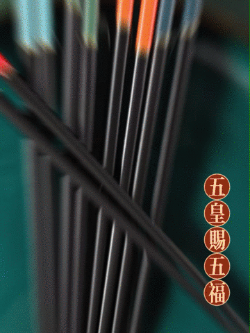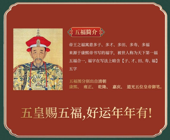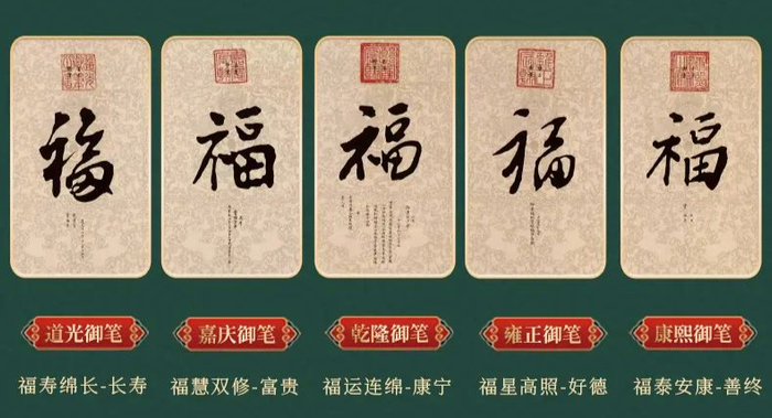 分别由五位帝王的御笔“福”字组成,每一双的福字都不同,寓意长寿、富贵、康宁、好德、安康。