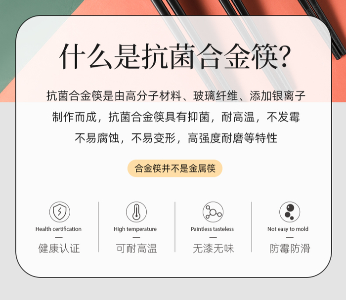 抗菌合金筷其实就是由玻璃纤维、高分子材料、外加银离子制作而成的,它具有抑菌、耐高温,不发霉、耐腐蚀,耐磨不易变形等优点。