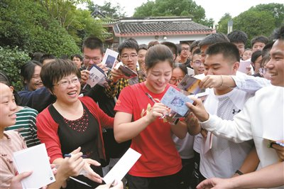 见面会的最后,还发生了一件特别的事情。当余依婷因为时间关系,不得不停止签名上车离去的时候,一些没有得到签名的同学难免觉得遗憾。这时他们突然要求镇海中学校长吴国平给他们签名,为满足这些学生的要求,吴校长也当仁不让“来来来,我给你们签名”。就这样,同学们又把吴国平围了起来。“机会难得,校长的签名也很珍贵的。”有同学在旁边交流着。