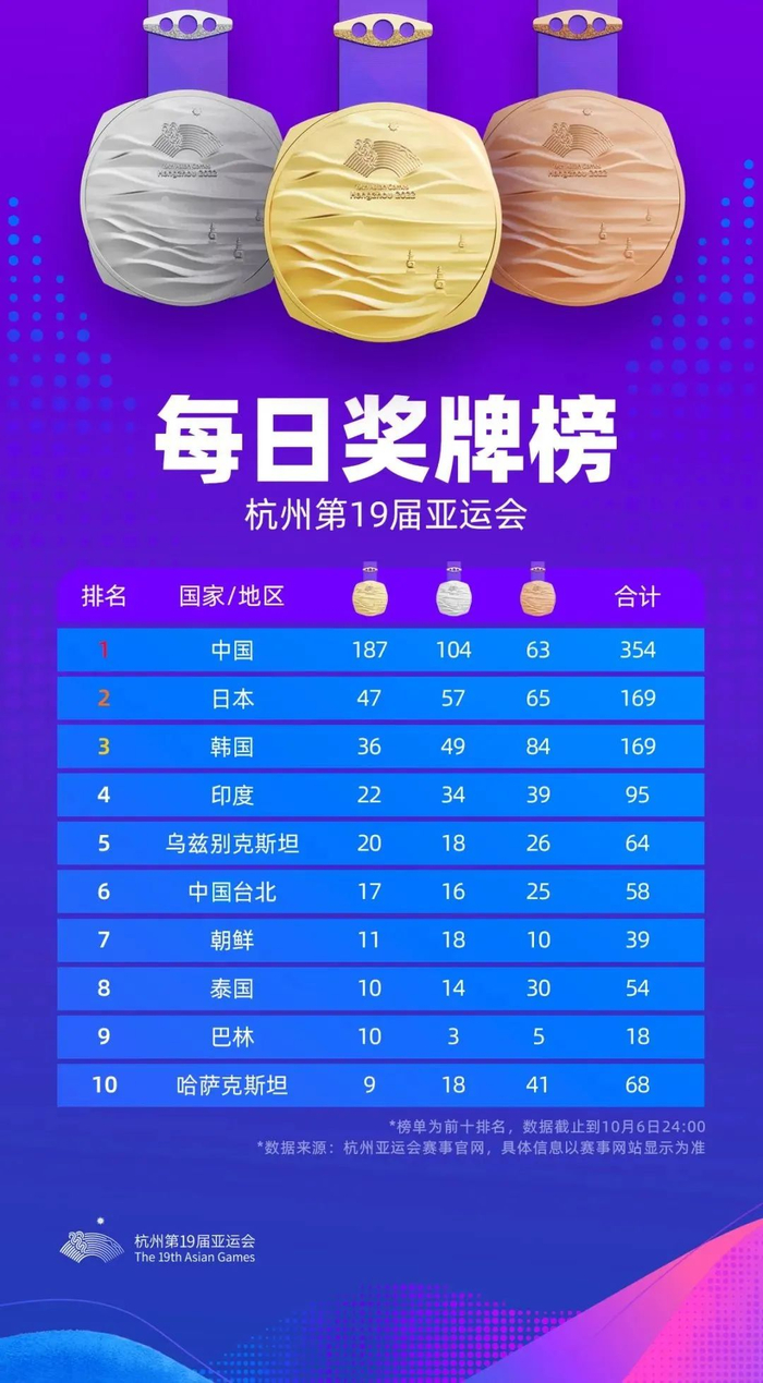 ●10月6日,杭州亚运会女足铜牌战中,中国女足队7:0大比分战胜乌兹别克斯坦队,获得亚运会铜牌。