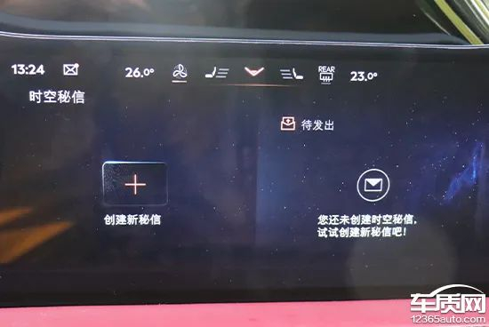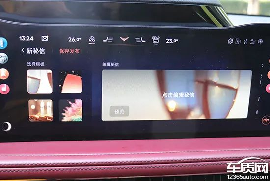 第四个亮点是时空密信功能,这个功能可以为自己或同车乘员带来一些小惊喜。在中控屏上找到“时空密信”功能并进入,然后按照提示先选择模板,然后点击编辑密信,完成编辑后再设置好提示弹出的日期和时间就可以了。当到了预设的提醒时间,设置好的密信就会在27英寸贯穿屏上显示,需要注意的是,显示时并不会有语音提醒,而是背景音乐+祝福画面。