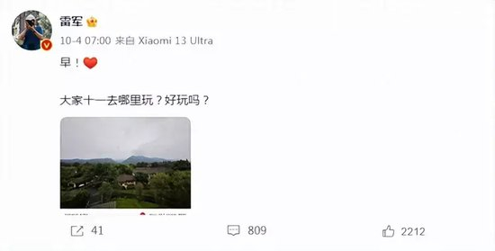 笔者在翻看雷军微博的时候发现。10月4日当天,雷军微博配图照片也为青城山六x酒店。