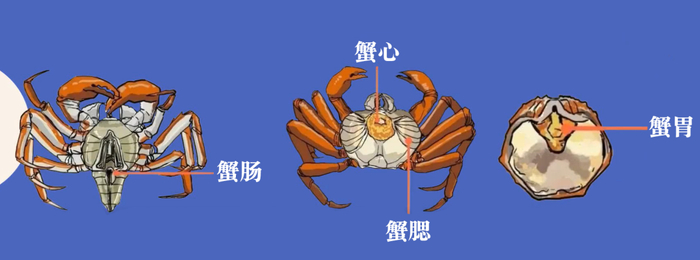 蟹壳前半部、眼睛下方的三角形部位是蟹胃,蟹背部打开小壳后看到的一条黑色条状物是蟹肠,这两个消化部位易积累污染物,应尽量避开。
