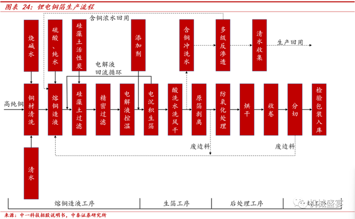 锂电铜箔的生产工艺主要包括:熔铜造液工序、生箔工序、后处理工序和分切工序。首先将高纯铜投入溶铜罐,并通过添加添加剂,将铜材电解成符合工艺标准的硫酸铜电解液。在电解槽中,硫酸铜电解液在直流电的作用下,二价铜离子(Cu2+)移动至生箔机阴极辊表面获取电子后还原成沉积层,经过阴极辊的连续转动、酸洗、水洗、风干、剥离后生成原箔。通过生箔机生成原箔后,进行防氧化处理、烘干、收卷等,制成铜箔后,需根据不同客户对于铜箔的厚度、品质、幅宽、重量等要求,对铜箔进行分切、检验、包装。