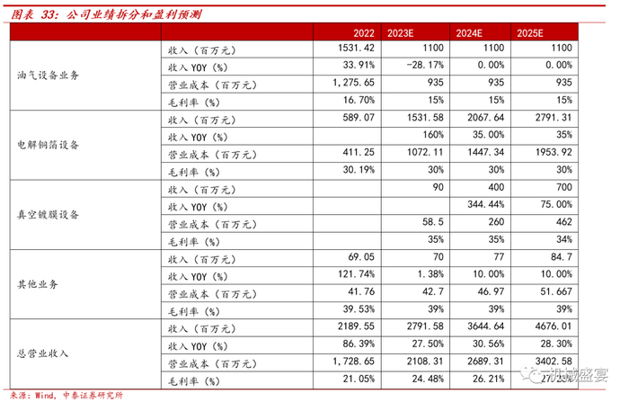 真空镀膜设备:公司布局复合集流体设备,根据洪田科技公众号2023年7月31日信息,公司复合铜箔设备顺利通过客户验证,首批订单落地,合同金额约为7000万元人民币。根据洪田科技公众号9月16日信息,公司研发的复合铜铝箔一体机设备“卷绕磁控溅射镀膜机”、“卷绕磁控溅射蒸镀复合镀膜机”、“卷绕蒸发镀膜机”再次斩获1.84亿元新订单。随着复合集流体行业发展,预计公司真空镀膜设备业务快速增长,考虑到公司真空镀膜设备进展迅速且已通过客户验收,在复合铜箔行业快速发展的背景下,预期公司真空镀膜设备将实现快速增长,假设2023-2025年,公司真空镀膜设备收入分别为0.9、4.0、7.0亿元;考虑到复合集流体行业处于快速发展阶段,预计其毛利率高于电解铜箔设备,参照其他复合集流体设备企业的盈利能力,假设2023-2025年,公司真空镀膜设备毛利率分别为35%、35%、34%。