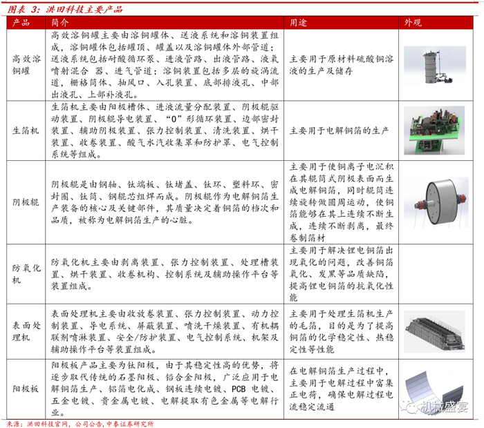 公司子公司洪田科技已经实现了锂电铜箔高精密设备的国产化替代,打破了进口设备对国内高端电解铜箔市场的垄断。洪田科技目前已成功研制出直径3米,幅宽1.82米的超大规格电解铜箔阴极辊、生箔机以及配套设备;能稳定生产高端极薄的锂电铜箔3.5μm产品以及5G 高频高速电子信息产品用的9μm超薄标准铜箔,该技术的创新突破,刷新了全球电解铜箔设备行业的新纪录。核心产品电解铜箔阴极辊、生箔机、阳极板、高效熔铜罐、表面处理机等年产能超过1000余台套。