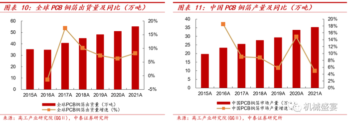 PCB铜箔需求稳定增长。根据GGII数据,2015-2021年,全球PCB铜箔出货量从35.1万吨增长至55.2万吨,CAGR约为7.8%;根据CCFA数据,2015-2021年中国PCB铜箔出货量从19.6万吨增长至35.2万吨,CAGR约为10.2%。随着电子产品智能化、5G发展等因素推动,预计PCB铜箔需求稳步增长,根据GGII预测,2030年全球电子电路铜箔出货量将达82.3万吨, 2021-2030年CAGR为3.1%。