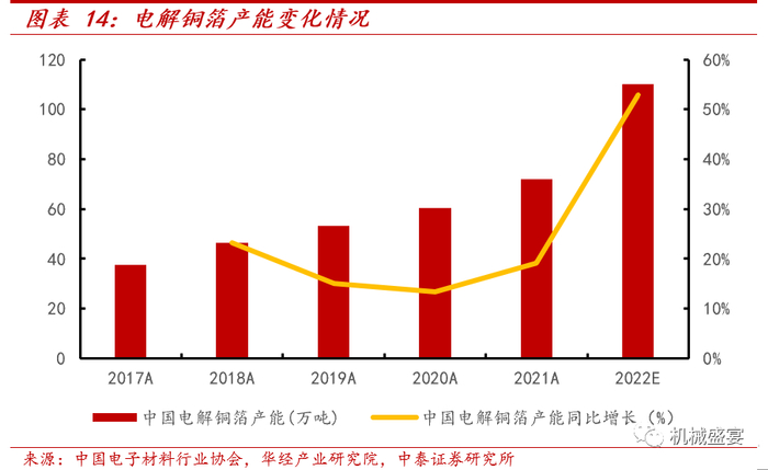 电解铜箔市场持续增长。据中国电子材料行业协会,2021年我国电解铜箔产能72.12万吨,同比增长19.17%。根据GGII,2021年度中国电解铜箔出货量达65.6万吨,同比增长48.5%。