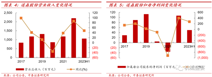 (2)转型后业绩快速增长。2017-2021年公司营业收入从8.30亿元增长至11.75亿元,归母净利润从0.29亿元减少至-0.36亿元。2022年,公司剥离低效资产实现转型后,新业务快速发展推动业绩扭亏为盈,实现收入21.90亿元,同比增长86.39%;归母净利润为1.06亿元,同比增长398.99%。2023H1,公司延续高增长势头,实现营业收入10.58亿元,同比增长48.42%;实现归母净利润0.49亿元,同比增长272.24%。随着下游需求增长和产能扩张,预期公司业绩高增长势头将延续。