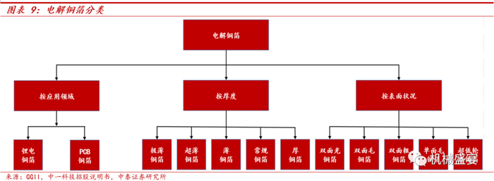 电解铜箔按照应用领域可分为PCB铜箔和锂电铜箔。铜箔是厚度 200μm以下的极薄铜带或铜片,按照制作工艺可分为压延铜箔和电解铜箔。由于电解法具有成本低、工艺简单等优势,成为行业主流。按照应用领域,电解铜箔可分为PCB铜箔和锂电铜箔。