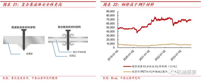(1)安全:复合集流体因其材料柔软,延展性优越,可以有效分散集流体表面应力,帮助锂离子沉积均匀,抑制锂枝晶产生,从而提升锂电池安全性能。同时在被刺穿时,PET/PP受热断开,连带上方的铜层一起断开,形成开路,避免因正负极短路造成热失控问题发生,复合铜箔在刺穿测试中可以做到只冒烟不起火的状态;