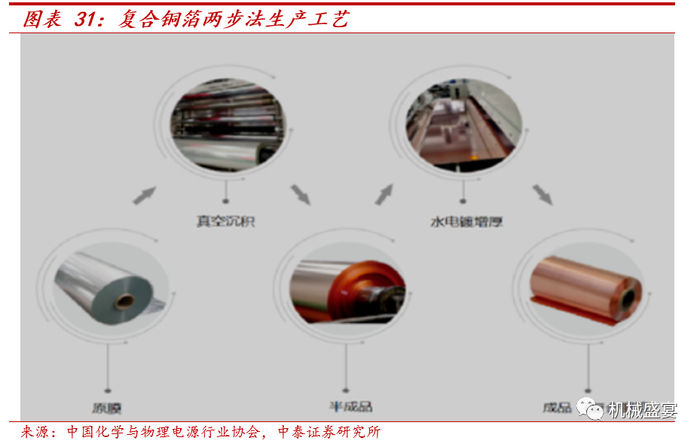 复合铜箔“两步法”生产工艺主要包括:真空磁控溅射和水电镀。复合铜箔一步法是PET/PP表面采用真空磁控溅射的方式制作一层金属层,两步法则是在此基础上采用水介质电镀的方式,将铜层加厚从而形成PET复合铜箔。复合铜箔“两步法”生产设备主要包括真空磁控溅射设备和电镀设备:前者的作用是制作铜种子层,后者的作用是将铜层加厚。