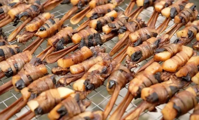 鸭脚包是阳江地区的一道地方特色风味小吃,把制作腊鸭剩下的鸭脚、鸭翅、鸭肝、鸭下巴,连同五花肉一起,用晒干的鸭肠捆绑好,加以配料腌制后晾晒而成,制作工艺复杂,味道香醇,已成为市民酒席、家宴中的佳肴,居家、旅游、休闲、馈赠亲友的首选佳品。