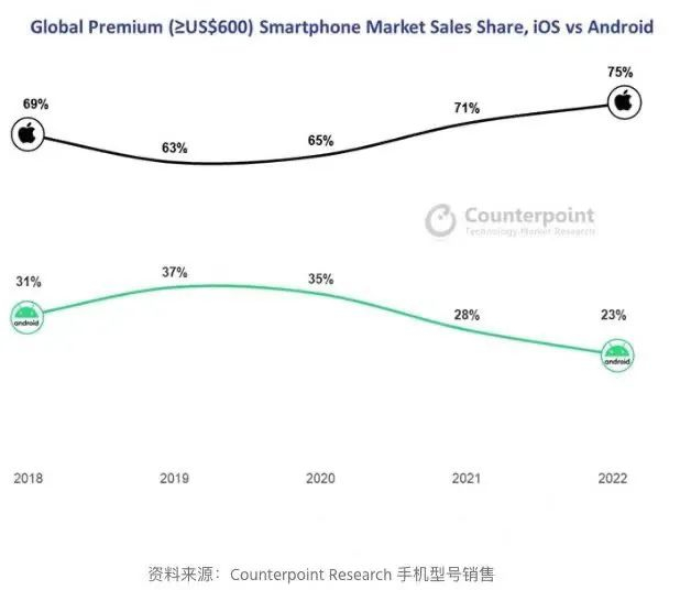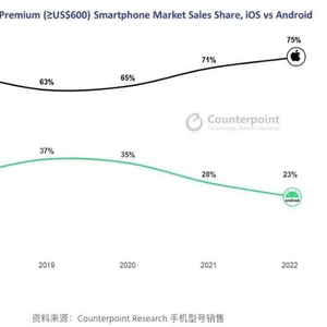 据科技行业研究机构Counterpoint数据,2022年高端手机市场对全球智能手机市场收入贡献首次超过一半。今年二季度,该细分市场的份额达到历史新高,全球每售出五台智能手机,其中就有一台是高端机型。