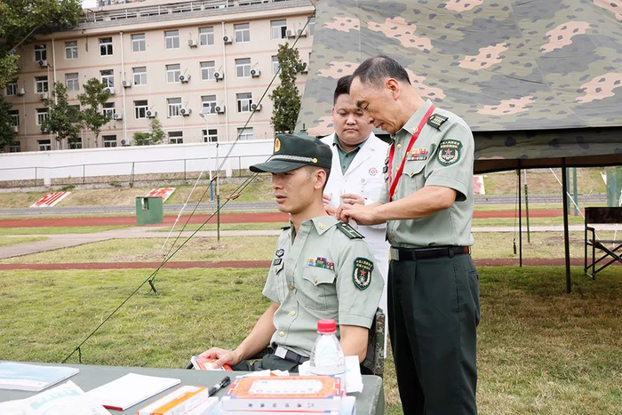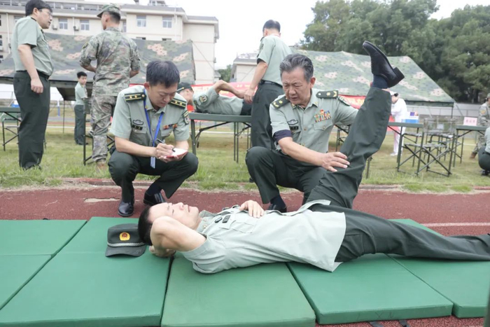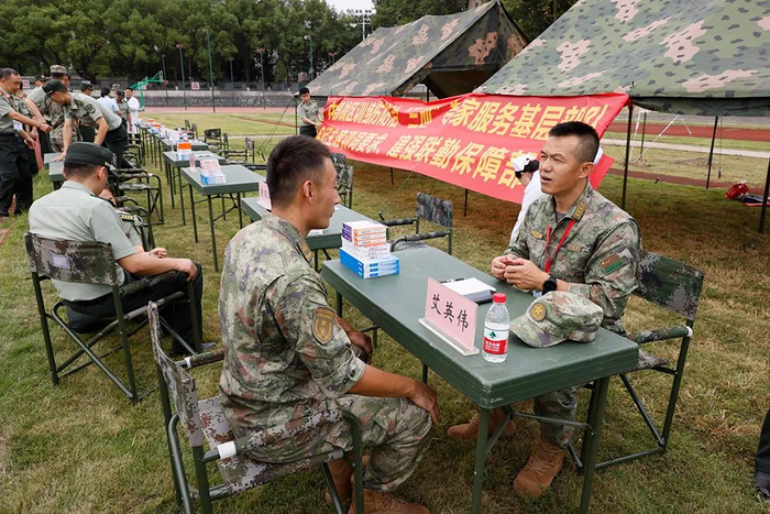 在义诊环节,专家们俯下身子仔细查看官兵训练损伤部位,现场为官兵们治疗训练伤,针灸治疗更是排起了长队。