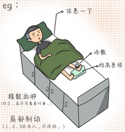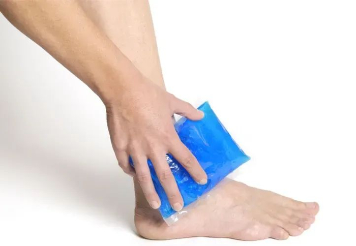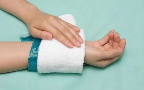 受伤后立即用冰袋冰敷受伤部位。冰敷时用干毛巾包裹冰袋,不要直接接触皮肤;也可以用冰棍或在乳胶手套内装冰块和水,对患处进行冰敷。
