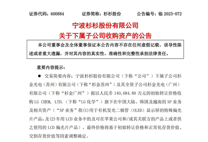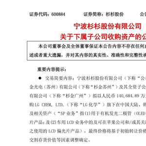 集微网报道(林美炳/文)9月27日晚,杉杉股份公告称,下属子公司杉金光电(苏州)有限公司及其全资子公司杉金光电(广州)有限公司(下文统称为杉金光电)拟以14.07亿元的初始转让价格收购LG化学旗下在中国大陆、韩国及越南的 SP 业务及相关资产。SP 业务包括用于有机发光二极管(OLED)显示屏的特殊偏光片产品;及车用 LCD 业务中的及可在苹果公司和/或其关联方的产品上或者供之使用的 LCD 偏光片产品。