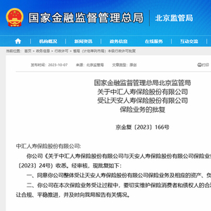 财联社10月7日讯(记者 彭科峰)10月7日,国家金融监督管理总局官网披露,北京监管局同意中汇人寿保险股份有限公司整体受让天安人寿保险股份有限公司保险业务及相应的资产、负债。