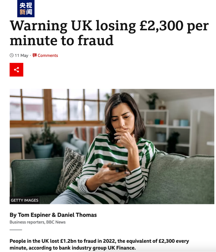 据英国银行和金融服务业贸易协会的统计,2022年,英国民众因诈骗造成的损失高达12亿英镑,相当于每分钟损失2300英镑。该协会称,去年一年内,仅英格兰和威尔士大约发生了370万起诈骗案件,占所有犯罪的40%以上,而投入此类案件的警察资源比例却不到总体的1%,其中涉及银行卡的诈骗最为常见,而电信诈骗呈现井喷态势。