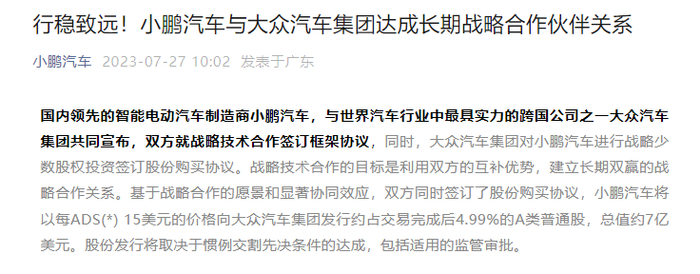在今年7月,小鹏汽车成功与德国大众建立战略合作关系,国内外影响力不断提升;8月,小鹏汽车与滴滴达成战略合作伙伴关系,携手加速“科技普惠、智能平权”的落地;