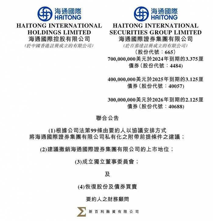 海通国际拟从港股私有化,要约人应付最高现金代价约34.7亿港元