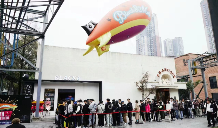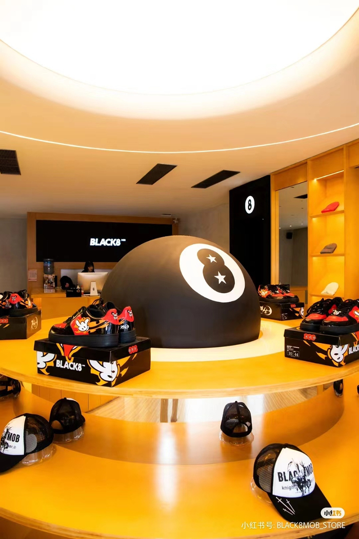 2019年成立于成都的小众潮牌BLACK8MOB,名字来源于桌球运动中意为决定胜负关键球“BLACK8MOB(黑色八号)”,并将8号桌球作为品牌logo呈现在门店、产品设计中,辨识度极高。