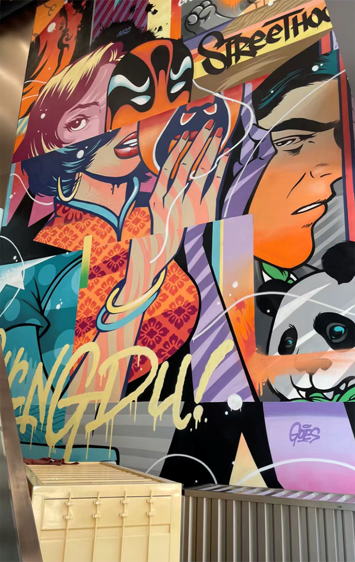 COSMO成都店中,结合川西传统建筑结构样式,并使用老船木、灰砖、玉石和绿植等材料;晶融汇店则以艺术家原创设计的hippo+熊猫、脸谱盖碗茶等成都传统城市文化元素涂鸦为背景,设计老唱片形式的展示道具。