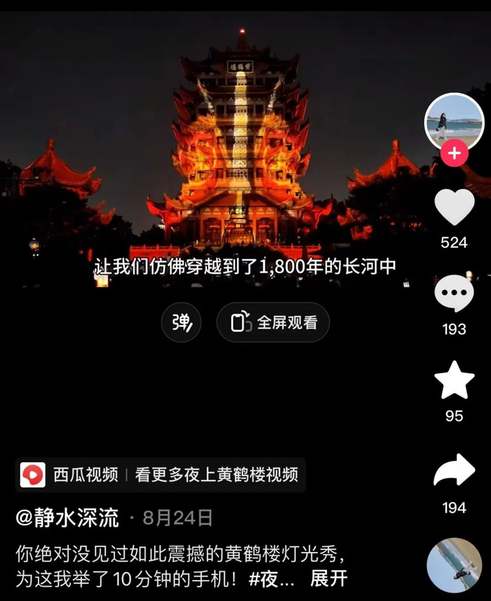 在抖音上,“夜上黄鹤楼”灯光秀也是被展示、传播和点赞转发最多的一个题材。在引人入胜的灯光变幻中,展示荆楚文明从蛮荒走来,一路演变的历程,仿佛穿越到1800年的长河中,久久沉醉。