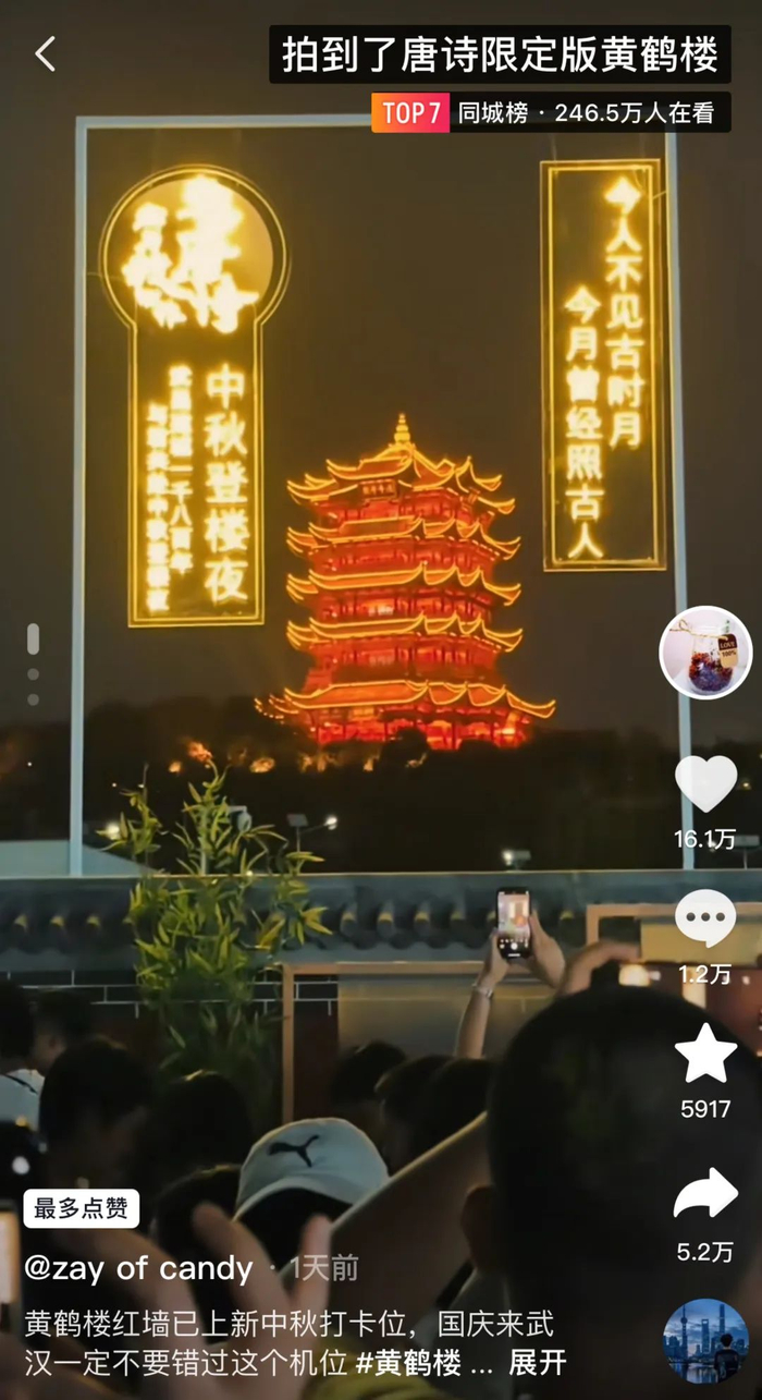 这部影片,不仅再次带火了“长安”,更引爆了三次出场的黄鹤楼。在七八月间,百万游客涌入武汉黄鹤楼,创下历史新高。在抖音上,#黄鹤楼 话题词播放高达12亿次。