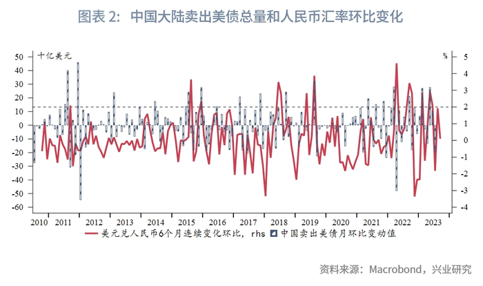 从历史数据来看,中国大陆卖出美债的整体趋势和美元兑人民币的变动具有一定的相关性。当美元兑人民币月度环比变化超过2%时,通常会出现中国大陆对美债的明显抛售。