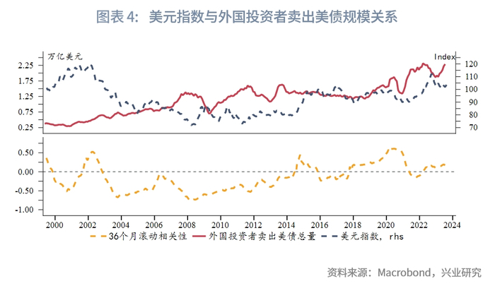 所有外国投资者净卖出美债与美元指数在2000-2002年间正负相关性交替变化,2003-2014年间呈现比较明确的反向关系,2015-2018年间,相关性较低,外国投资者卖出美债的总量维持在温和水平。2018-2021年则逐渐转为正相关,2022年至今再度回归相关性较低的状态。