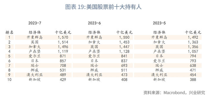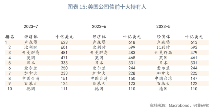 从季节图来看,6月外国投资者同期净买入水平处在近10年来最高水平,7月有所回落但依旧高于历史平均水平。总持仓最高的前三大经济体没有变化,为卢森堡、比利时、开曼群岛。6月净买入前三大经济体为卢森堡、开曼群岛、日本,6月净卖出前三大经济体为荷兰、法国、韩国。7月净买入前三大经济体为爱尔兰、瑞士、英国,7月卖出前三大经济体为开曼群岛、阿鲁巴岛、比利时。