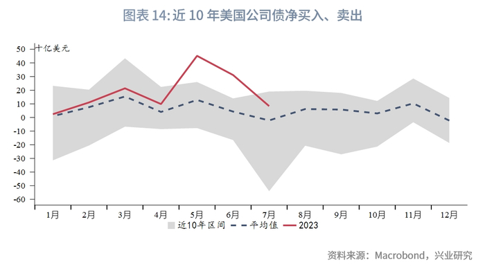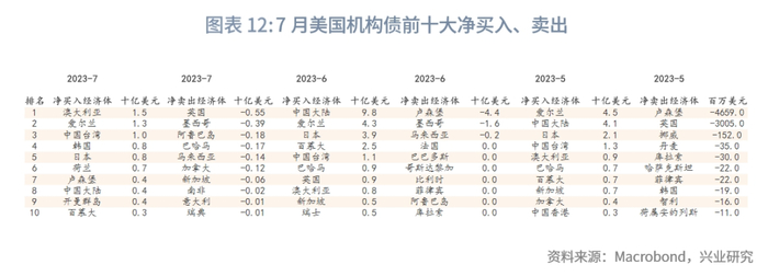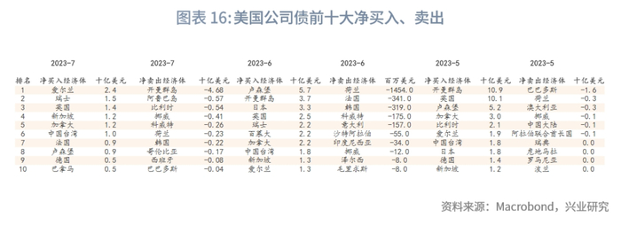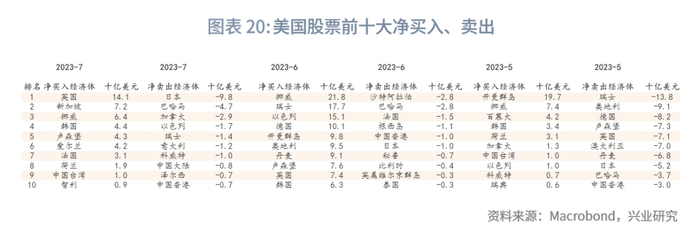 从季节图来看,目前外国投资者净买入为近十年来历史最低水平。总持仓最高的前三大经济体没有变化,为中国大陆、日本、中国台湾。月度交易数据方面,6月净买入前三大经济体为中国大陆、爱尔兰、日本,6月净卖出前三大经济体为卢森堡、墨西哥、马来西亚。7月净买入前三大经济体为澳大利亚、爱尔兰、中国台湾,7月净卖出前三大经济体为英国、墨西哥、阿鲁巴岛。