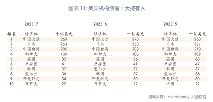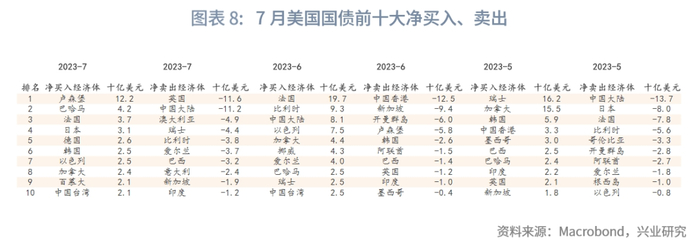 月度持有数据方面,外国投资者持有的美国国债总量为6.6万亿美元,总持仓维持在历史高位附近。从季节图来看,6月外国投资者净买入水平较5月上升,7月较6月净买入水平再度下降,回到历史平均水平。总持仓最高的前三大经济体没有变化,仍为日本、中国大陆、英国。月度交易数据方面,6月净买入前三大经济体为法国、比利时、中国大陆,6月净卖出前三大经济体为中国香港、新加坡、开曼群岛。7月净买入前三大经济体为卢森堡、巴哈马、法国,7月净卖出前三大经济体为英国、中国大陆、澳大利亚。