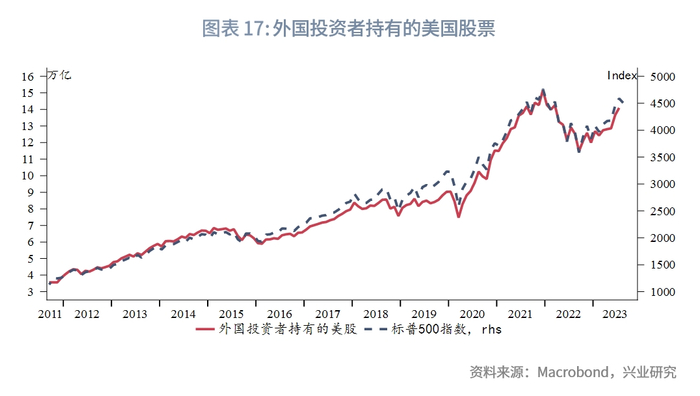 月度持有数据方面,外国投资者持有的美股总量为12.8万亿美元,名义持仓量变动与标普500指数基本同步。2020年之后净买入卖出波动明显加大。
