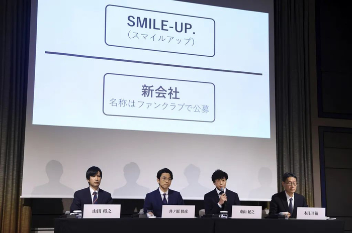 2023 年 10 月 2 日,杰尼斯事务所现任社长东山纪之正式宣布,公司将“解体”,停止艺人管理及培养业务,并更名为“SMILE-UP.”,另行成立的代理经纪公司则通过粉丝俱乐部公开募集名称。