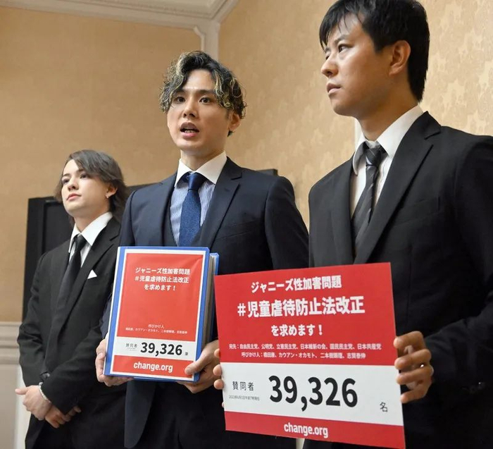 ●2023 年 5 月 5 日,指控喜多川性侵的 3 名当事人冈本考安、桥田康、二本树显理来到日本国会,提交了 3.9 万个网络签名请愿,呼吁日本政府修改《虐待儿童防止法》。图片来源 | TBS News