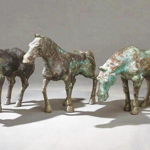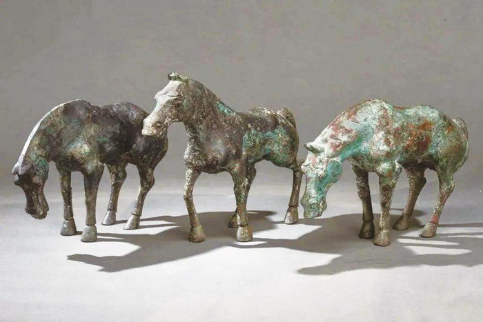 中国传统艺术造型“写意为上,写实为下”。例如,甘肃的“马踏飞燕”,唐太宗的“昭陵六骏”,肥大飘逸,有如神助。而这三匹青铜马却恰恰相反,是写实主义的杰作。其中一匹昂首行走,另外两匹低头伫立,均没有飞扬雀跃的意思,似乎在寻找水草,也可能情绪沮丧。从肌肉发达的臀部和后腿,可以看出它们惯于奔跑。